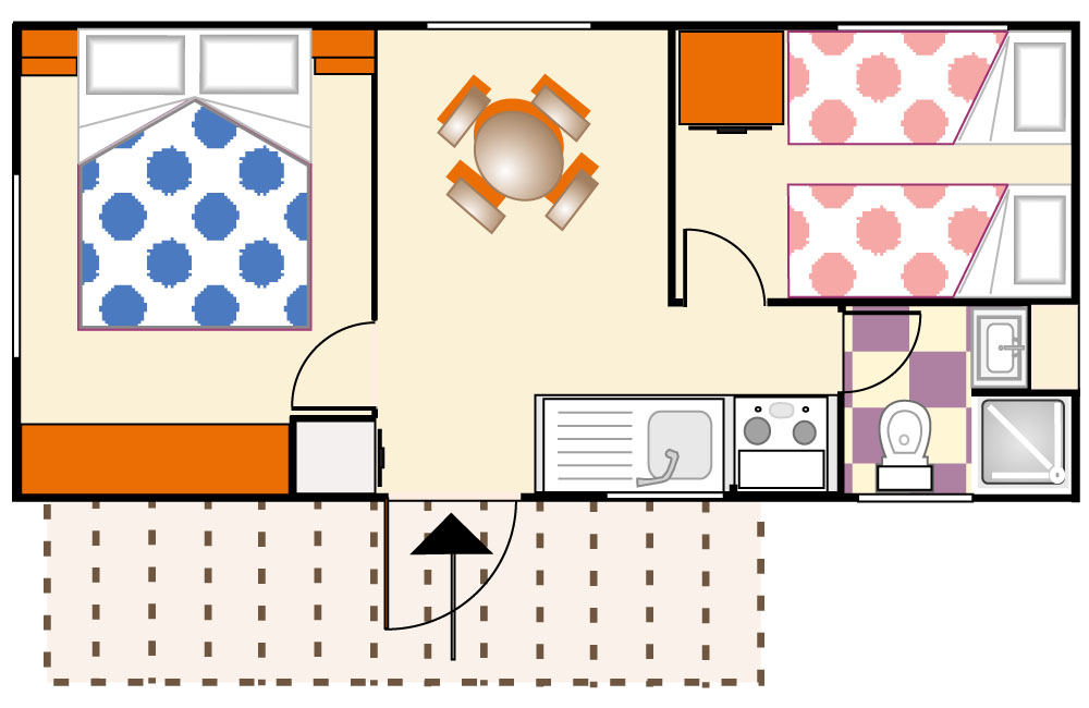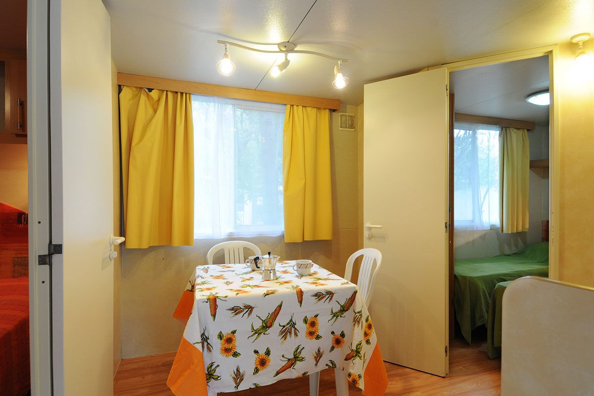 Comprende camera matrimoniale, cameretta con due letti singoli, soggiorno-pranzo con angolo cottura completo di lavello e frigo, bagno con wc, lavandino e doccia, acqua calda, aria condizionata, veranda con pergolato, giardino e parcheggio auto riservato ombreggiato. Completamente arredato compresa attrezzatura da cucina.