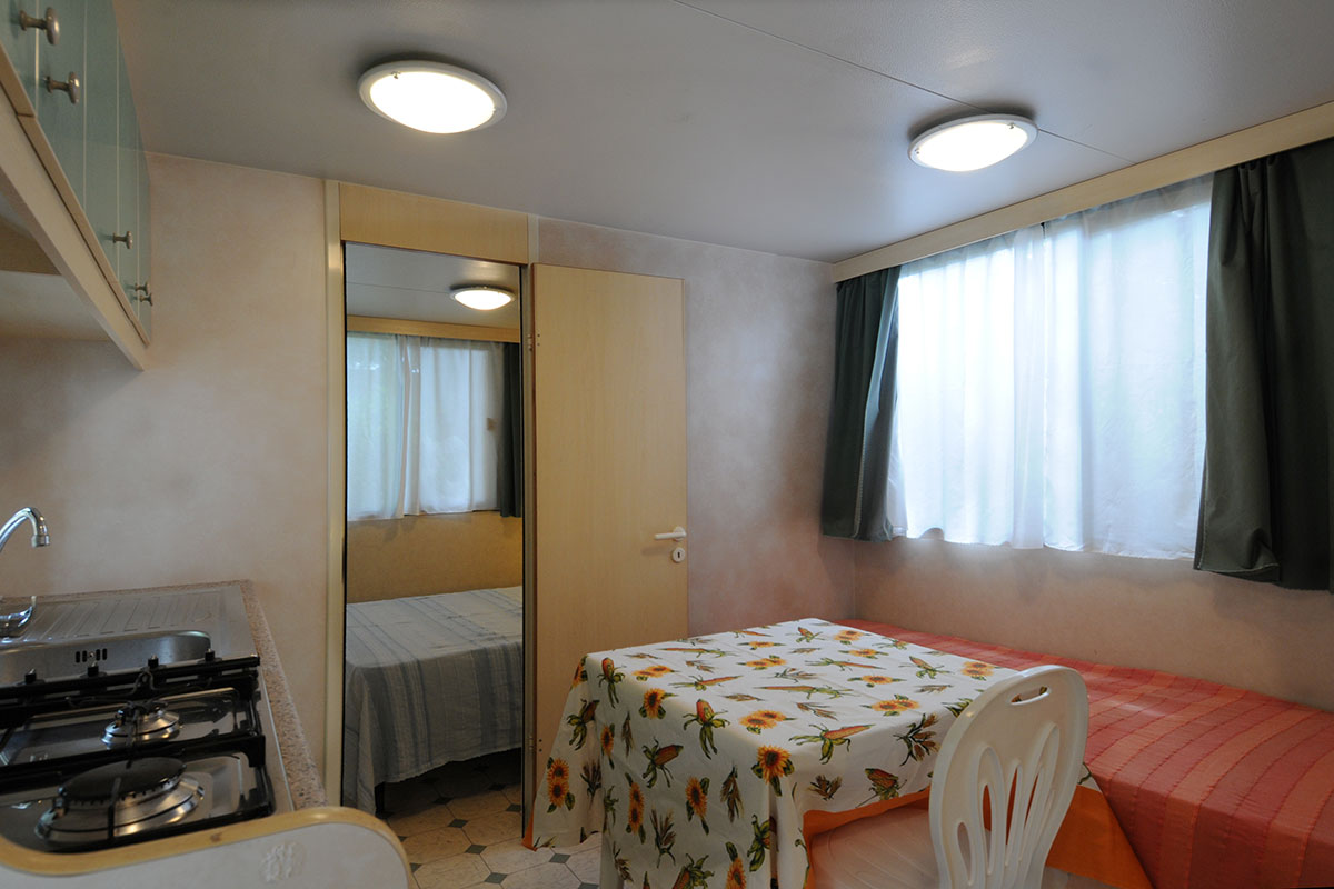 Camprende camera matrimoniale, cameretta con due letti singoli, soggiorno-pranzo con angolo cottura completo di lavello e frigo, bagno con wc, lavandino e doccia, acqua calda, veranda con pergolato, giardino e parcheggio auto riservato ombreggiato. Completamente arredato compresa attrezzatura da cucina.