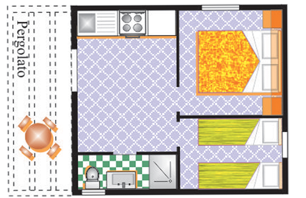 Comprende camera matrimoniale, cameretta con due letti singoli, soggiorno-pranzo con angolo cottura completo di lavello e frigo, servizio wc con lavandino e doccia, acqua calda, aria condizionata, veranda con pergolato, giardino e parcheggio auto riservato ombreggiato. Completamente arredato compresa attrezzatura da cucina.