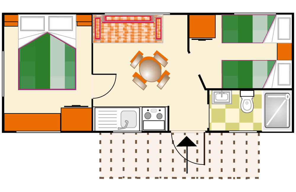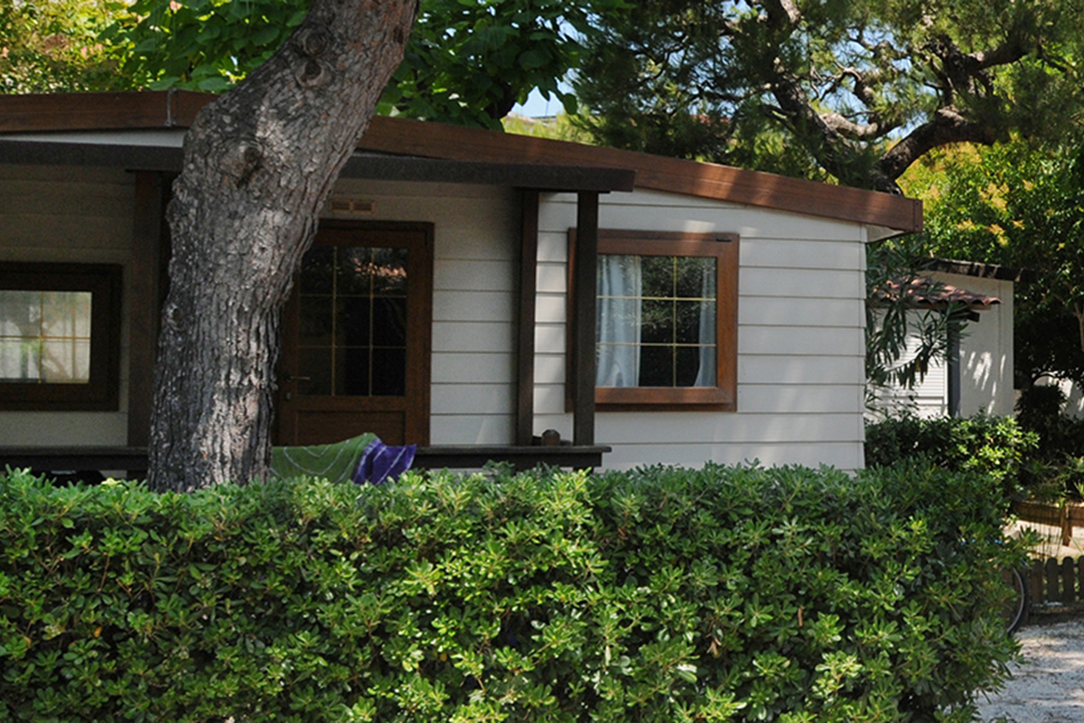 Comprende camera matrimoniale, cameretta con due letti singoli, soggiorno-pranzo con angolo cottura completo di lavello e frigo, bagno con wc, lavandino, doccia, acqua calda, aria condizionata, veranda con pergolato, giardino e parcheggio auto riservato ombreggiato. Completamente arredato compresa attrezzatura da cucina.